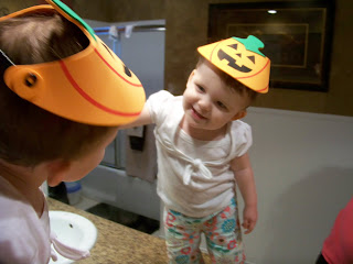 Claire loves to look in the mirror at herself. She makes funny faces and just laughs at herself. It is so funny to watch! I bought her a pumpkin hat and had to get a picture. She does not like anything on her head, which worries me a little for Halloween, so getting her picture with the hat on was quite a task. Enjoy Claire admiring herself. :)
